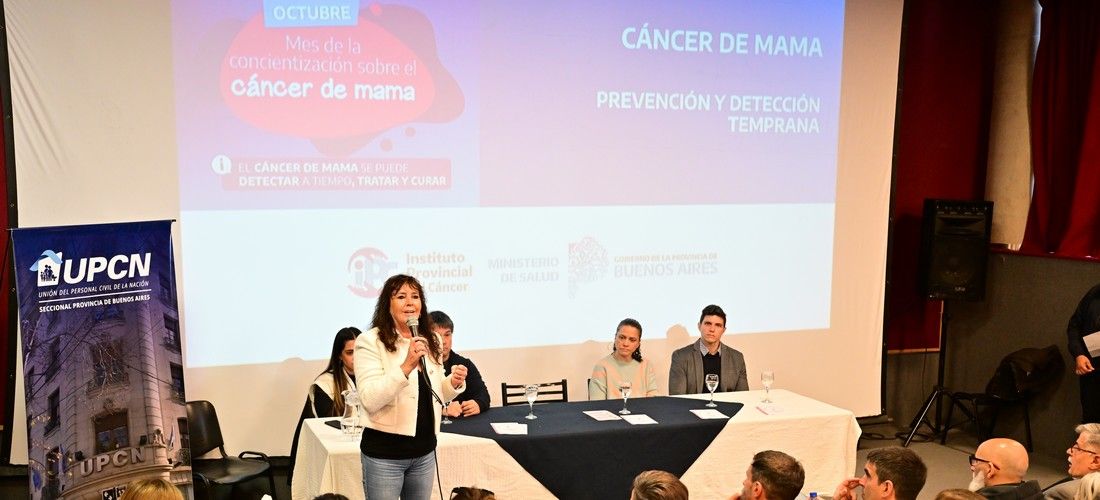 En el marco de las actividades por el Mes de la Lucha contra el Cáncer de Mama, la Secretaria General de la Unión del Personal Civil de la Nación (UPCN), Seccional Provincia de Buenos Aires, Fabiola Mosquera, participó de la jornada informativa “Hablemos de cáncer de mama”, realizada hoy -martes 28- en el Edificio Bicentenario. Como anfitriona, la titular de la organización realizó la apertura de la charla y dio la bienvenida a los disertantes y la concurrencia.