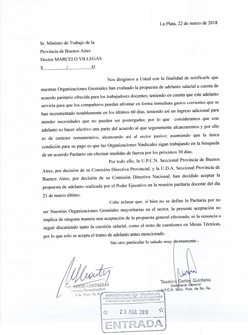 Tal como ocurrió en 2017, este dinero se abona en concepto de adelanto a cuenta del futuro acuerdo paritario, y que fue ofrecido en la reunión de paritaria salarial del 21 de marzo pasado a las organizaciones gremiales presentes, siendo aceptada por U.P.C.N. y U.D.A. “teniendo en cuenta que el anticipo serviría para que los compañeros puedan afrontar gastos corrientes que se han incrementado notablemente y para atender necesidades que no pueden ser postergadas”.