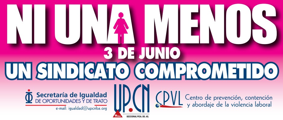 La secretaría de Igualdad de Oportunidades y de Trato y el centro de Contención, Prevención y Abordaje de la Violencia Laboral de la Unión del Personal Civil de la Nación (UPCN), Seccional provincia de Buenos Aires, invitan a trabajadores y trabajadoras afiliadas o no, a delegados y a la comunidad en general a participar de la marcha #Ni una menos que se realizará el viernes 3 de junio próximo, desde las 16 horas.