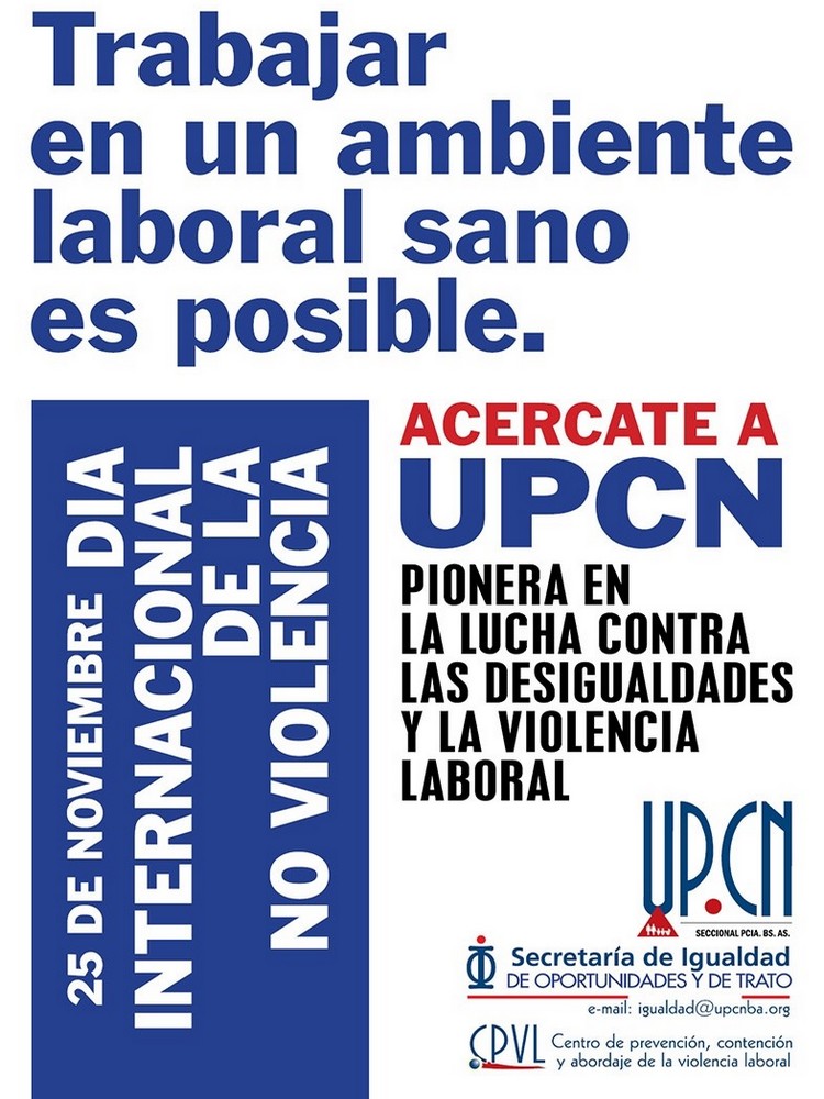 La Unión del Personal Civil de la Nación (UPCN), Seccional provincia de Buenos Aires, a través de su secretaría de Igualdad de Oportunidades y de Trato y del centro de Prevención, Contención y Abordaje de la Violencia Laboral, en el mes de la No Violencia, invita a compartir en las redes sociales los siguientes banners.