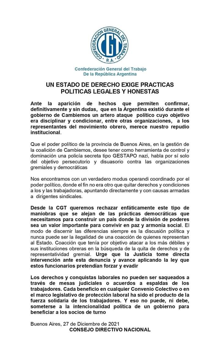Un Estado de Derecho exige prácticas políticas legales y honestas Comunicado del Consejo Directivo Nacional de la Confederación General del Trabajo (CGT) de la República Argentina. Creado el 27 Diciembre 2021. Anterior Siguiente