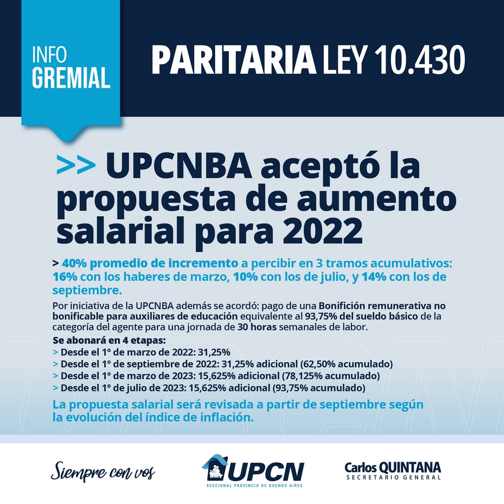 La Unión del Personal Civil de la Nación (UPCN), Seccional provincia de Buenos Aires, aceptó hoy el incremento salarial del 40% promedio propuesto por el Gobierno bonaerense hasta el mes de septiembre próximo, en el marco de las paritarias correspondientes a los trabajadores encuadrados en la ley 10.430.