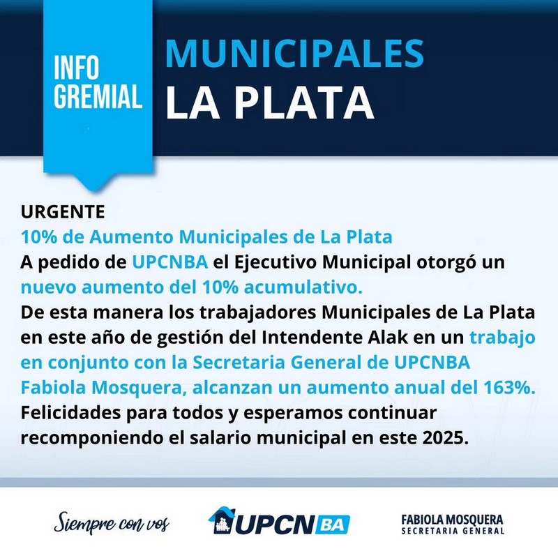 UPCNBA y el municipo de La Plata acordaron un aumento en los salarios de los agentes de la Comuna Gremial Es del 10% y totaliza, en el año 2024, un 163%. Creado el 31 Diciembre 2024. Anterior Siguiente