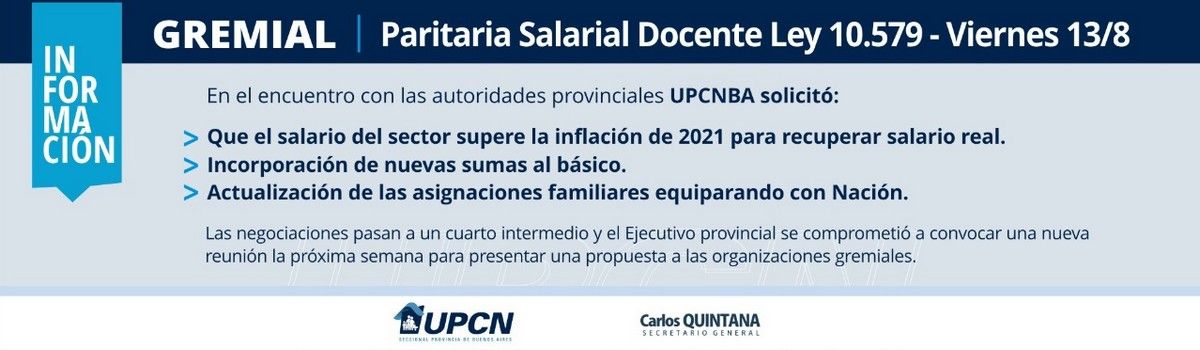 Conforme lo acordado en el encuentro paritario de julio pasado, entre el secretario General de la Unión del Personal Civil de la Nación (UPCN), Seccional provincia de Buenos Aires, Carlos Quintana, y las autoridades de la Provincia, comenzó esta mañana la mesa técnica de recomposición salarial para lo que resta del año 2021 de los trabajadores y trabajadoras docentes.