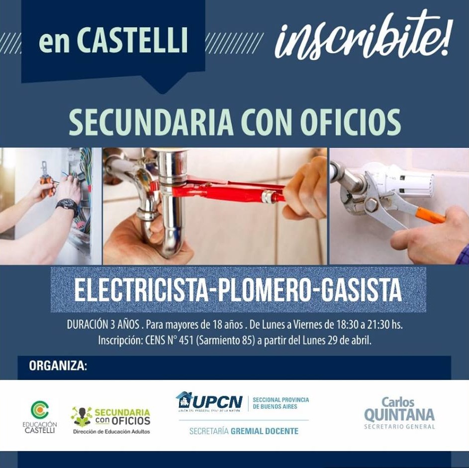 Las inscripciones a la Secundaria de Oficios (con especialización en Electricista, Plomero o Gasista) se encuentran abiertas desde hoy (lunes 29) en el CENS N° 451 (Sarmiento 85, de Castelli).